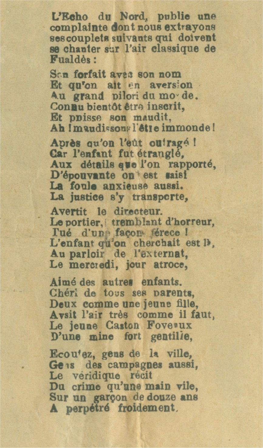 - Un crime horrible, un enfant assassiné et violé à Lille, complainte