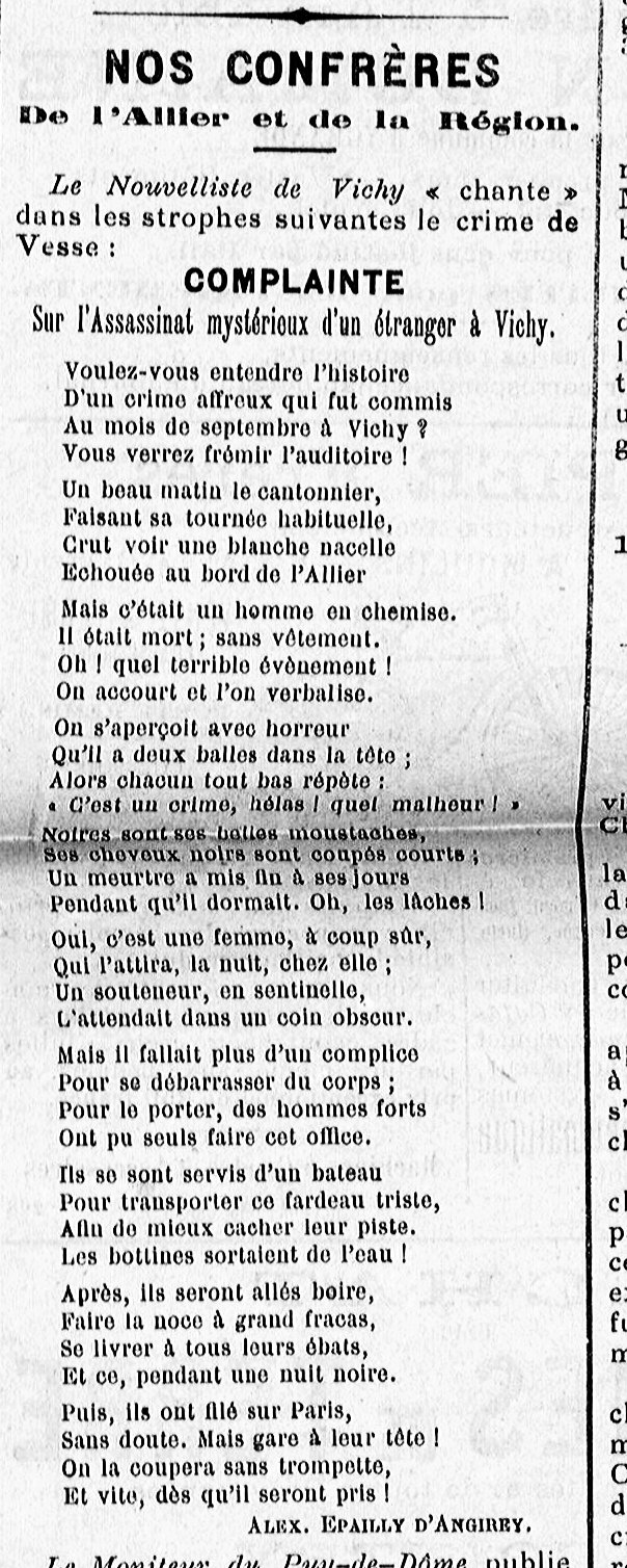 Complainte sur l'assassinat mystérieux d'un étranger à Vichy
