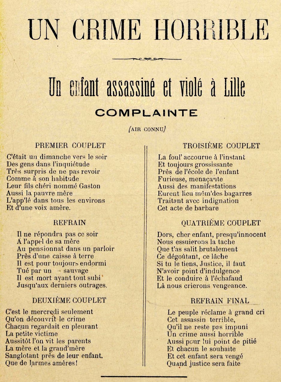 Un crime horrible, un enfant assassiné et violé à Lille, complainte